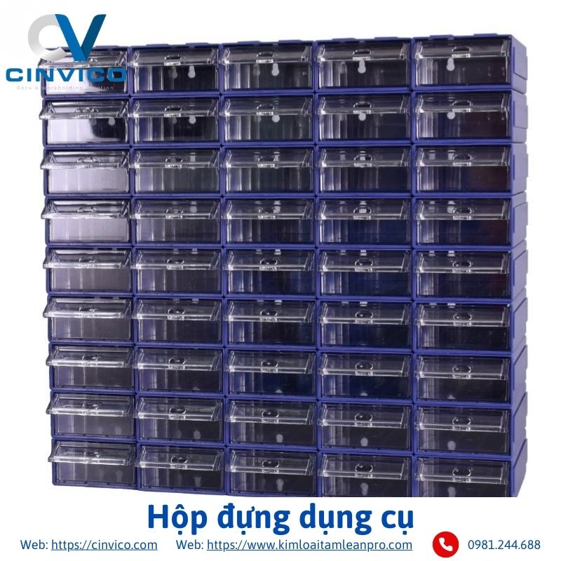 Hộp đựng dụng cụ là dòng sản phẩm lưu trữ phụ kiện được Cinvico nghiên cứu, lựa chọn và gia công theo tiêu chuẩn kỹ thuật, đáp ứng nhu cầu sắp xếp linh kiện, dụng cụ nhỏ và phụ kiện kỹ thuật trong kho xưởng, phòng kỹ thuật hoặc khu vực sản xuất. Với thiết kế hiện đại, gọn gàng và khả năng xếp chồng linh hoạt, sản phẩm giúp tối ưu không gian lưu trữ, tạo sự ngăn nắp và nâng cao hiệu quả làm việc trong môi trường công nghiệp, kho vận và bảo trì kỹ thuật.